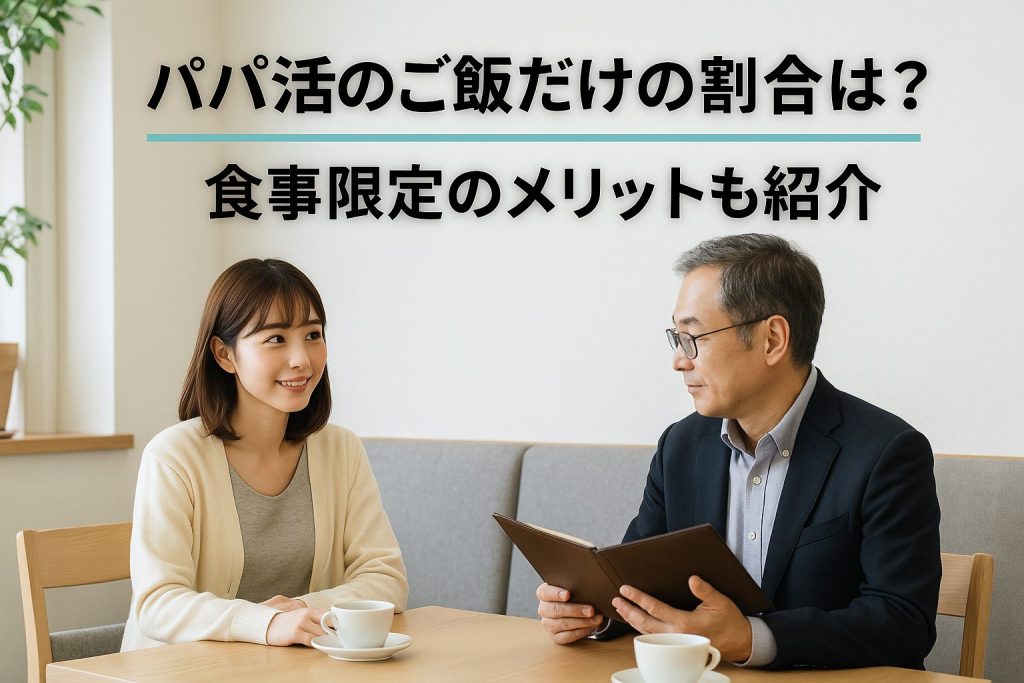 なお、パパ活でよく聞く「ご飯だけ」「茶飯(ちゃはん)」とは、体の関係なしに食事やお茶でデートを楽しむスタイルのこと。お手当は大人ありと比べれば控えめですが、リスクが少なく初心者にも取り組みやすいと人気です。次の章では、このご飯だけパパ活の実態をデータを交えて見ていきます。