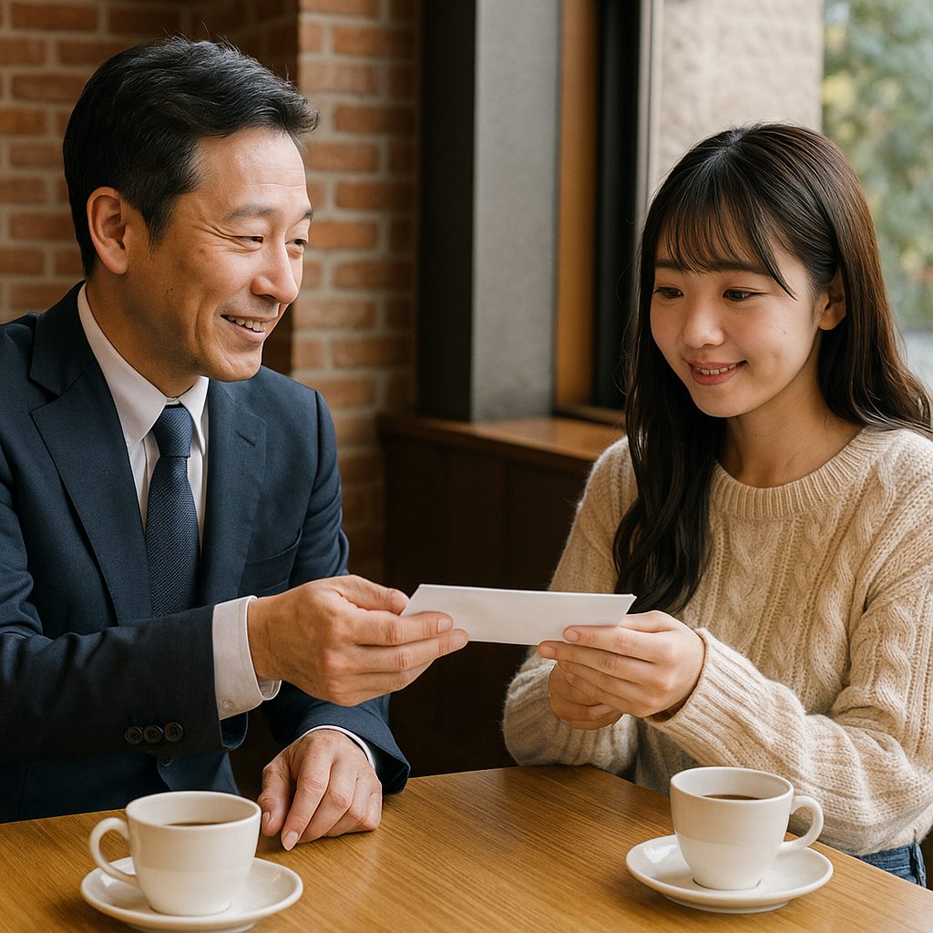 人目のあるカフェやホテルのラウンジで短時間会い、相性を確かめる。交通費やお茶代としてお手当の提示を。