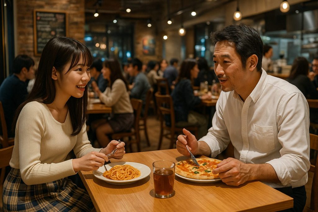 ランチタイムや早めのディナーで利用できるカジュアルレストランは、程よく賑やかで話しやすい雰囲気です。完全個室や薄暗すぎる店は避け、半個室や仕切りのある席を選ぶと安心。初対面でお酒を飲むのは控えめにしましょう。