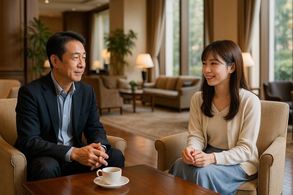 移動中は簡単な自己紹介をしながら歩き、カフェやラウンジに着いたら世間話からスタート。仕事や趣味など軽い話題で雰囲気を温めて、相手の人柄や会話のテンポをチェックします。